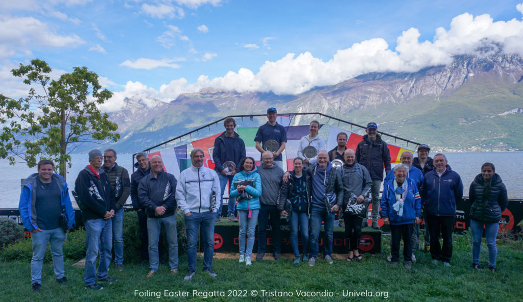 Upwindfoilen wurde zuvor bei Thymeks 3-tägiger A-Cat Clinic fleißig geübt. Matthias und Peter Pfortner waren sogar 4 Wochen zuvor schon mal in Campione. Aber es nützte alles nichts. Zum Kräfte sparen überließen wir das Upwindfoilen lieber den Spitzenseglern Thymek, Rutger, Robin und Roeland. Nein halt, noch einen Unerschrockenen gab es, den Schweizer Philippe Jacot. Nicht mehr der Jüngste, aber als ehemaliger furchtloser Eishockeyspieler war er beim Upwindfoilen voll dabei. Nur Downwindfoilen war bei ihm noch ein Desaster, da konnte man alsmal wieder vorbeiziehen.