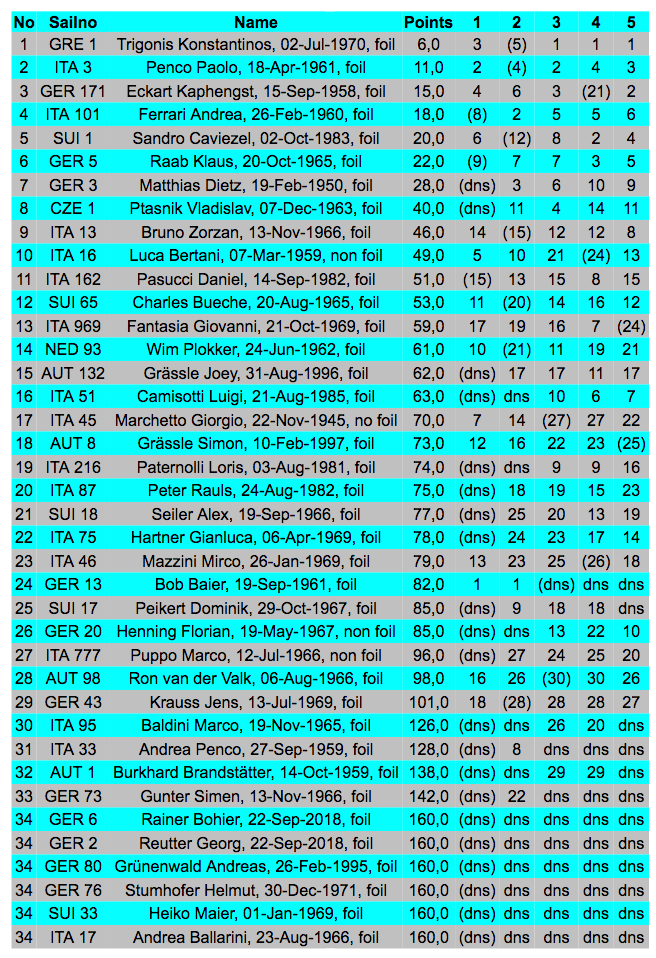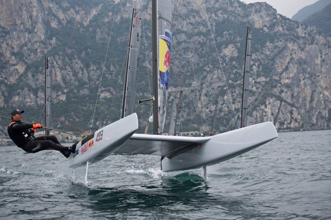 Bei sehr wenig Wind ging es pünktlich zum ersten Mal auf die Regattabahn. Mit einschlafendem Wind musste die Wettfahrt aber abgebrochen werden. Erst am späten Nachmittag dann zwei weitere Wettfahrten. Die Hälfte des Starterfelds wurde dabei kalt erwischt. Durch die ewige Warterei zermürbt, waren viele Segler bereits in eine Warteposition Richtung Club gefahren. Die sich aufbauende Thermik blieb aber dieser Stelle des Sees fern und das Startboot war nicht rechtzeitig zu erreichen, so dass die erste Wettfahrt im kleineren Rahmen durchgeführt wurde. Bob Baier hat beide Wettfahrten des Samstags gewonnen, konnte aber am Sonntag nicht mehr teilnehmen. Auch der Sonntag begann mit warten auf Wind. Wer die Geduld aufbrachte, wurde aber mit traumhaften Bedingungen und drei weiteren Wettfahrten belohnt. Sieger war am Ende Kostas Trigonis vor Paolo Penco und Eckart Kaphengst, der mit dieser Platzierung bei seiner ersten A-Cat Regatta bereits ein Ausrufezeichen gesetzt hat. Der erfahrene Katamaransegler aus Kiel hatte nach ein paar Trainingstagen mit Kostas Trigonis in Torbole sein neues Sportgerät erstaunlich gut im Griff.