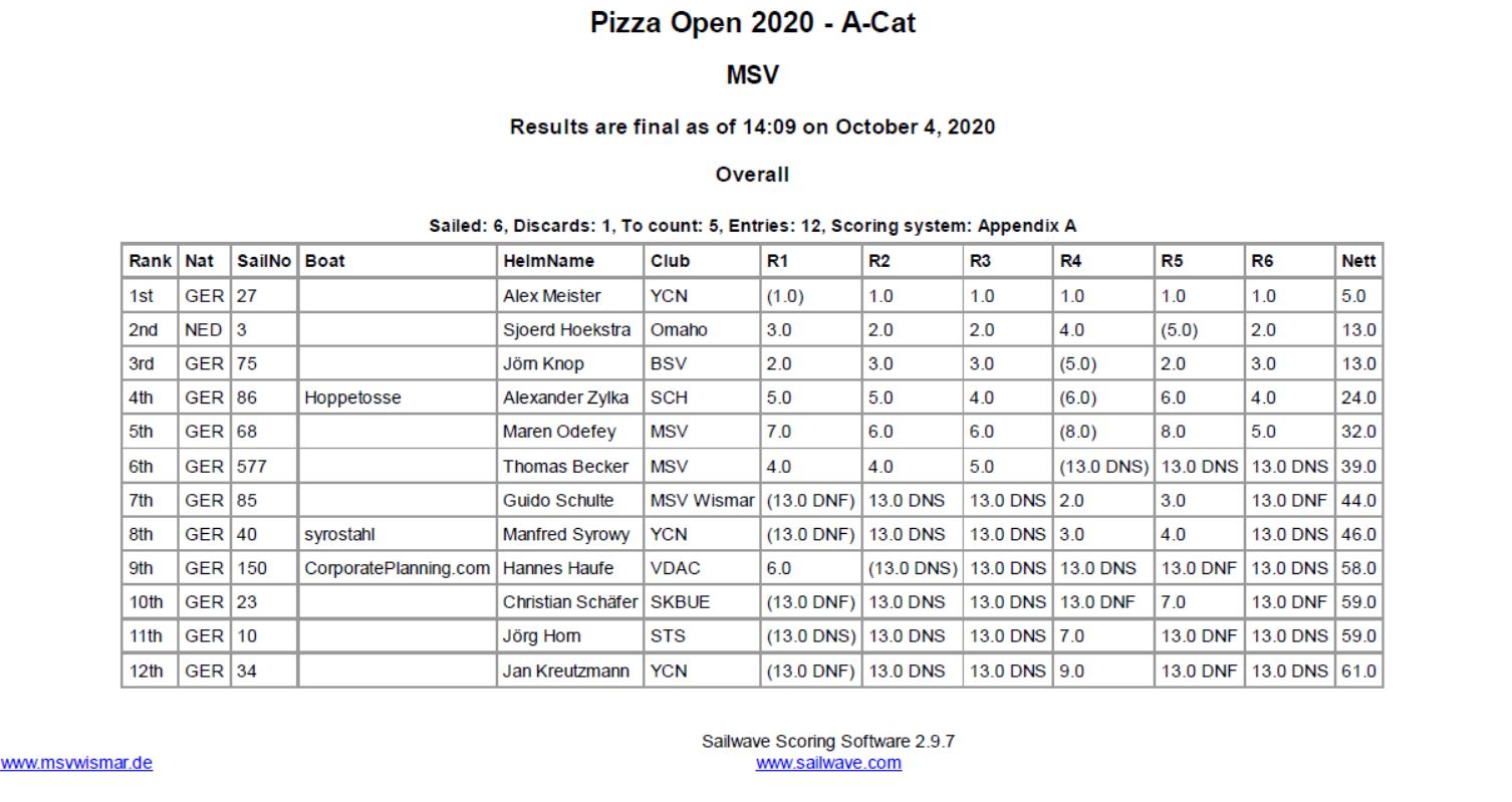 Cleansweep for Alex Meister in A-Class in „Pizza Open“ Regatta, Wismar, Baltic Sea
