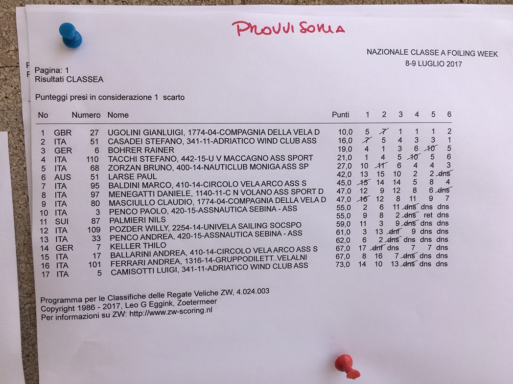 Wir haben das Programm mit drei Wettfahrten pro Tag bei 17 gestarteten Booten effizient durchgebracht. Gewonnen haben Gianluigi Ugolini (IT, 10 Pkt) vor Stefano Casadei (IT, 16 Pk). Nachdem ich die Leichtwindsitzung am ersten Tag noch führend beendete, konnte ich am Starkwindtag den dritten Platz trotz gerissener Mastrotation verteidigen, – was ein Ritt, eher halbwindfoilend irgendwie Richtung Luvtonne… 😮