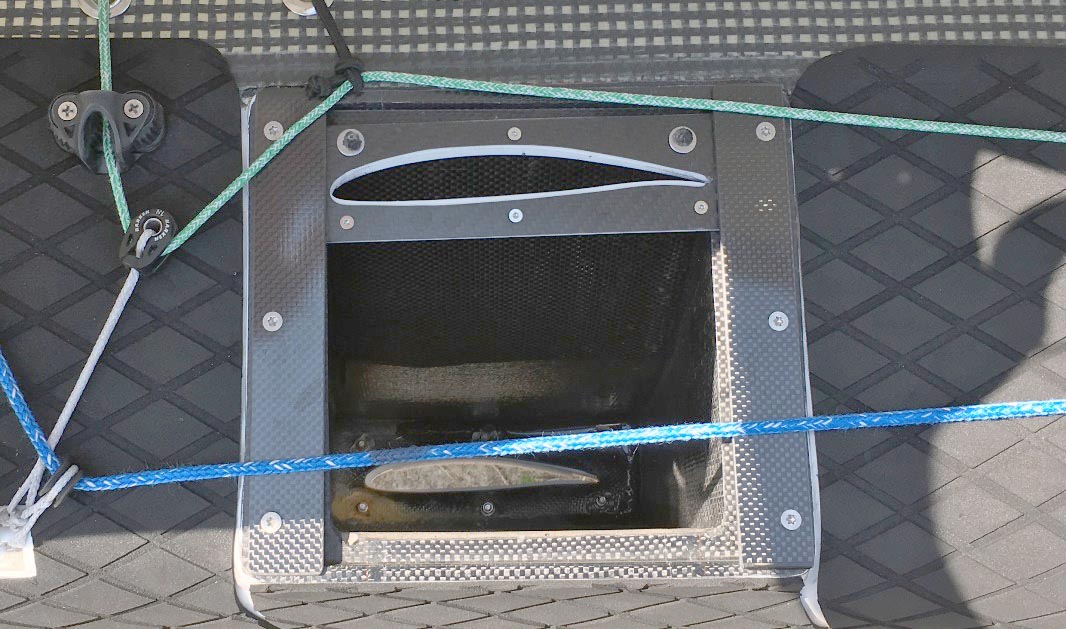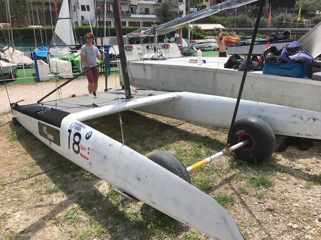 Thilo war auch mit seinem neuen Boot am Start, dem „Nano AC – Prototyp“. Ein interessantes Konzept, das Thilo auch auf Facebook in einem kleinen Video erklärt. Er fährt mit deutlich asymmetrischen, langen C-Schwertern, die bzgl. der Anstellung nicht verstellt werden, sie verändern jedoch automatisch die Neigung zur vertikalen Achse (Luv-Schwert eher senkrecht, Lee-Schwert mehr horizontal mit Hauptauftrieb und größerem Moment, in statischer Position wird somit der Mindestabstand der Foils von 75 cm zur Bootsachse eingehalten). So fällt wieder eine Stellmöglichkeit weg. Die Schwerter liefern mE etwas mehr Auftrieb als die akt. gängigen Modelle, sodass Thilo etwas früher raus kam und insb. auf der Kreuz schon bei ca. 7-8 knt stabil foilen konnte. Bei leichten und starken Wind ist die Idee, den Auftrieb bzw. den höheren Drag über leichtes Herausziehen der Schwerter zu regulieren. Das Boot soll auch vermarktet werden und könnte sich nach Angaben von Thilo preislich zwischen DNA und Exploder bewegen.