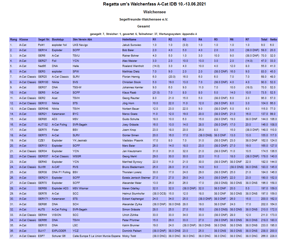 In Corona-Zeiten bedarf es großer Anstrengungen und viel Frustrationstoleranz, um eine aufwändige Regatta wie eine IDB der A-Cats zu organisieren. Das Risiko ist groß, durch pandemiebedingte Auflagen massiv gehindert zu werden oder niedrige Teilnehmerzahlen in Kauf nehmen zu müssen. Die Segelfreunde Walchensee um ihren Vorsitzenden Ulrich Begemann und den A-Cat-Klassenpräsidenten Matthias Dietz ließen sich davon nicht entmutigen und stellten eine „kontaktlose“ Regatta auf die Beine, die selbst von den strengen bayrischen Behörden genehmigt wurde. Ein solcher Einsatz in schwierigen Zeiten kann gar nicht genug gewürdigt werden.
