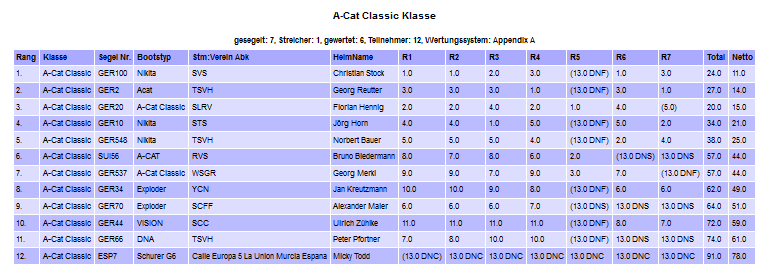 Bei der Classic-Division konnte sich Christan Stock vom Schluchsee knapp gegen Georg Reuter (Ammersee) und Florian Hennig (Forggensee) durchsetzen. Das Feld der Classics war sehr kompakt und die Zieleinläufe waren oft eng. Man muss also kein Flugboot haben, um bei einer A-Cat-Meisterschaft guten Sport und starke Konkurrenz zu erleben.