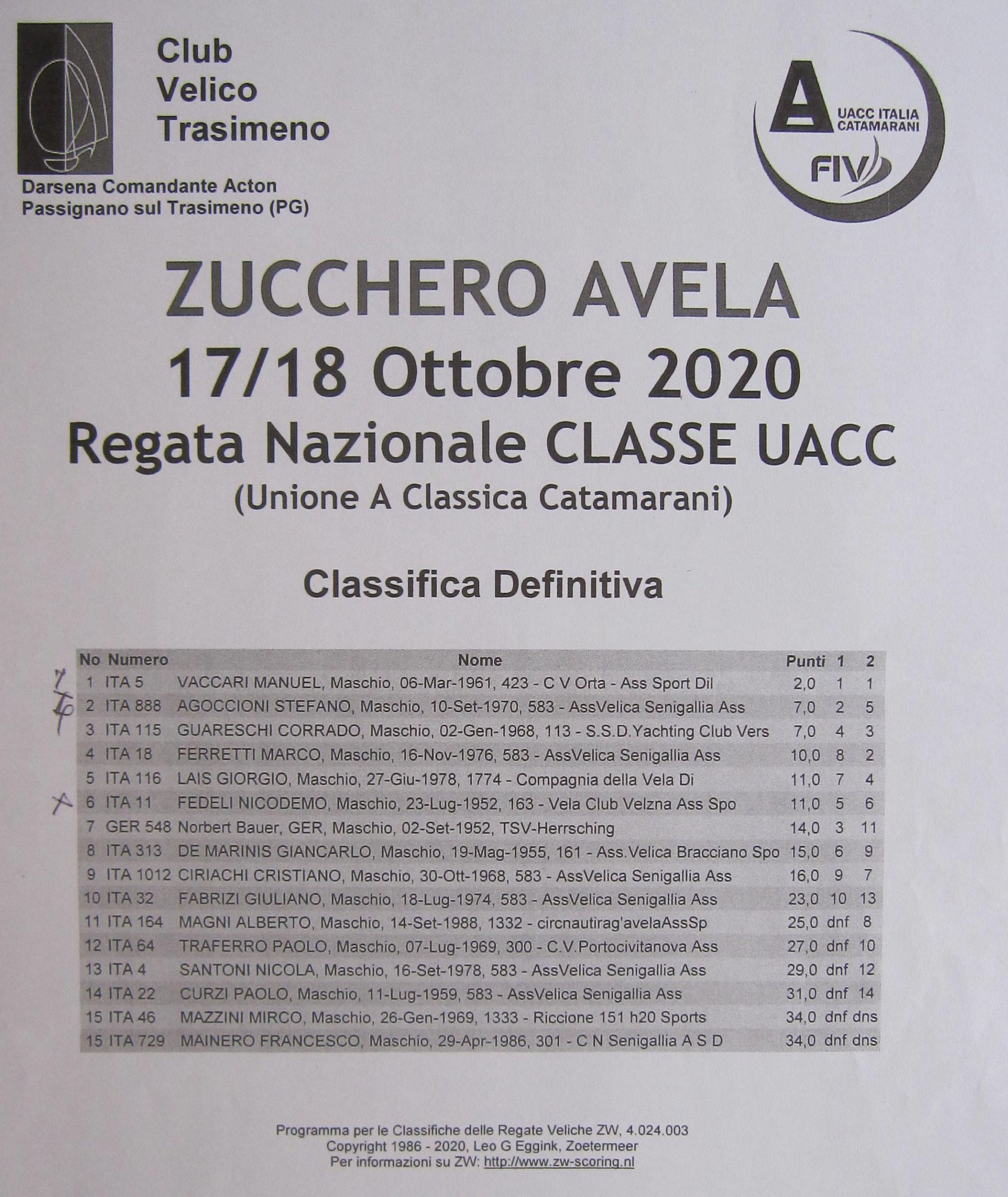 Traditionell gibt es Ende Oktober die Regatta „Zucchero A Vela“ beim Club Velico Trasimeno. Es bedeutet Puderzucker, der Name kommt vom Zuckerfestival das immer zeitgleich in Perugia stattfindet. Leider war auch der Wind wie Puderzucker verflogen. Am Samstag konnten die 16 Classic A-Cats eine verkürzte Wettfahrt bei Wind von 2-1 Bft. abflauend durchführen. 6 Boote konnten das Zeitlimit nicht mehr erreichen. Am Sonntag gab es bei gleichen Bedingungen nochmal eine verkürzte Wettfahrt. Entschädigt wurden wir mit Top-Verpflegung in einem sehr gastfreundlichen Club.