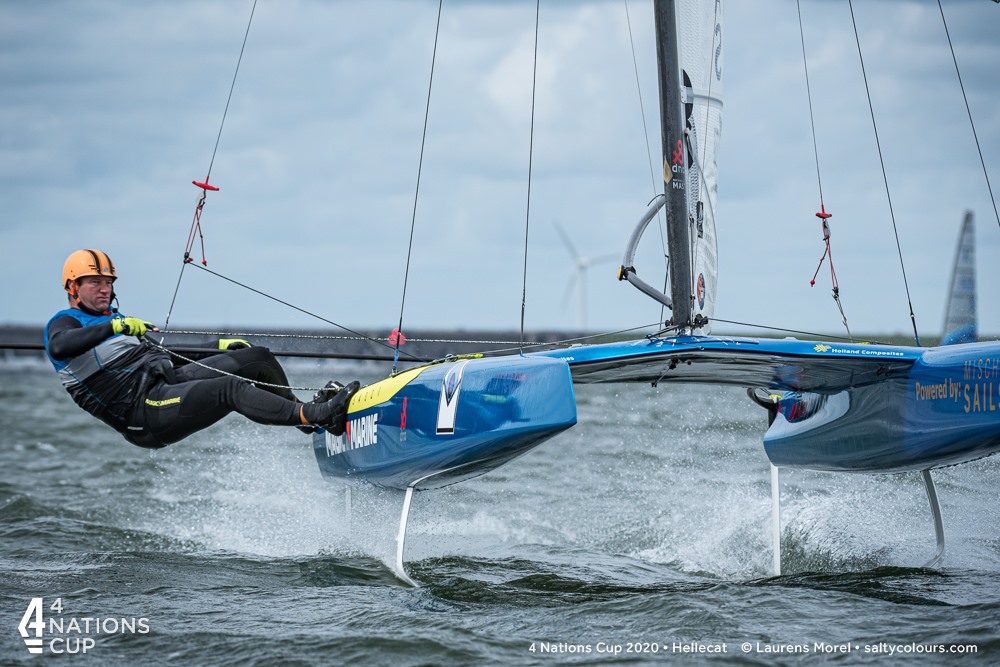 „Pssshhhhhh“. Da ist es wieder, dieses durchdringende, unüberhörbare Geräusch. Es stammt von Mischa Heemskerk, der wie immer bereits wenige Sekunden nach dem Startsignal seinen A-Cat auf die Foils hebt und davon zischt. Niemand beherrscht das Am-Wind-Foilen so gut wie er. Er macht dabei nicht nur rund 19 Knoten Bootsgeschwindigkeit, sondern erzielt auch eine gute Höhe. Um das Segel richtig dicht nehmen zu können, hat er bei der Großschot eine Untersetzung von 1 zu 13,5 eingebaut. Selbst er als ausgesprochen kräftiger Segler hätte sonst angesichts eines scheinbaren Windes von bis zu 39 Knoten erhebliche Probleme, die gewaltigen Kräfte zu beherrschen. Schon nach drei Minuten hat Mischa einige hundert Meter Vorsprung herausgefahren, er ist hier beim 4Nations-Cup im südholländischen Hellevoetsluis in einer eigenen Liga unterwegs.