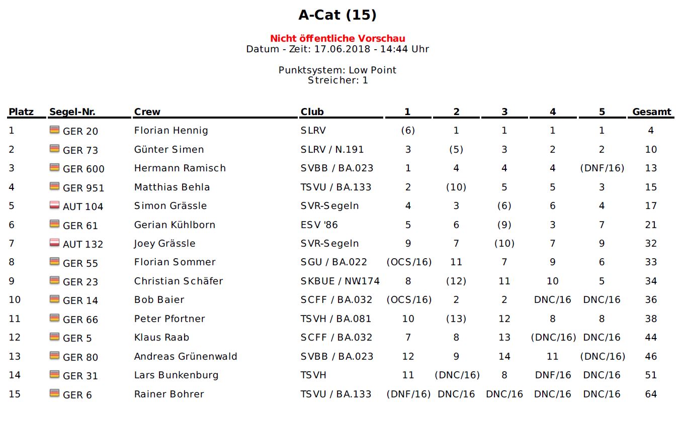 Am ersten Wettfahrttag reichte der Wind für zwei Wettfahrten bei leichtem bis löchrigen Nordostwind. Die ersten Plätze teilten sich hier Hermann Ramisch und Florian Hennig. Am Sonntag war die Startbereitschaft schon um 9 Uhr angesetzt und zunächst machte der auf westliche Richtungen gedrehte Wind einen guten Eindruck um gleich darauf ähnlich unstet wie am Vortag zu werden. Dennoch konnte die Wettfahrtleitung hier drei Rennen starten, die allesamt Florian Hennig für sich entscheiden konnte und damit die Gesamtwertung deutlich für sich entscheiden konnte.