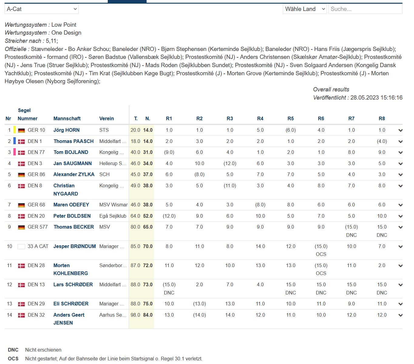 Der Showdown, der noch einige Positionen veränderte und schlussendlich Jörg Horn den Sieg brachte, ereignete sich im letzten Rennen kurz vor dem Ziel: Bei sehr leichtem Wind war Jörg deutlich schneller als der Rest und schon längst im Ziel, als Thomas Paasch, Jan Saugmann und Maren Odefey dicht beieinander liegend in einem Windloch nahezu zum Stillstand kamen. Morten Kohlenberg und Ich kamen aus großem Abstand von hinten und konnten noch vor Thomas Paasch hindurch schlüpfen. Dieser wurde hierdurch in diesem Rennen Vierter und konnte in der Folge sein bislang schlechtestes Ergebnis (Platz 3 in Rennen 2) nicht streichen.