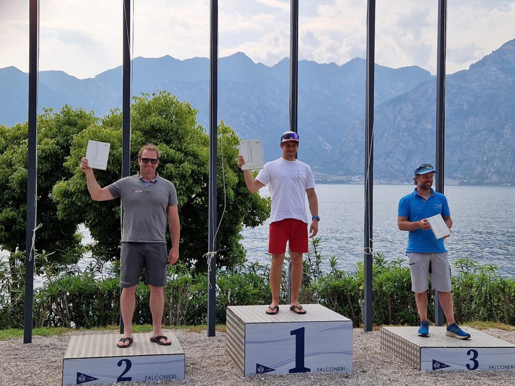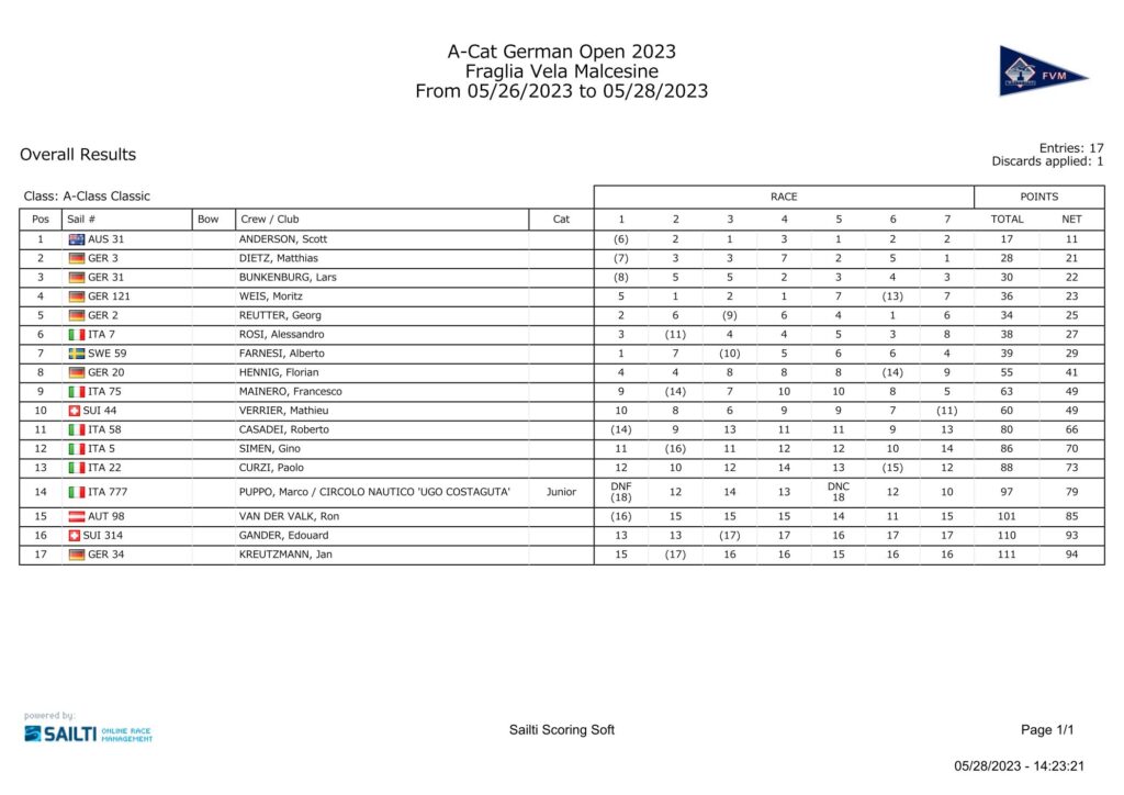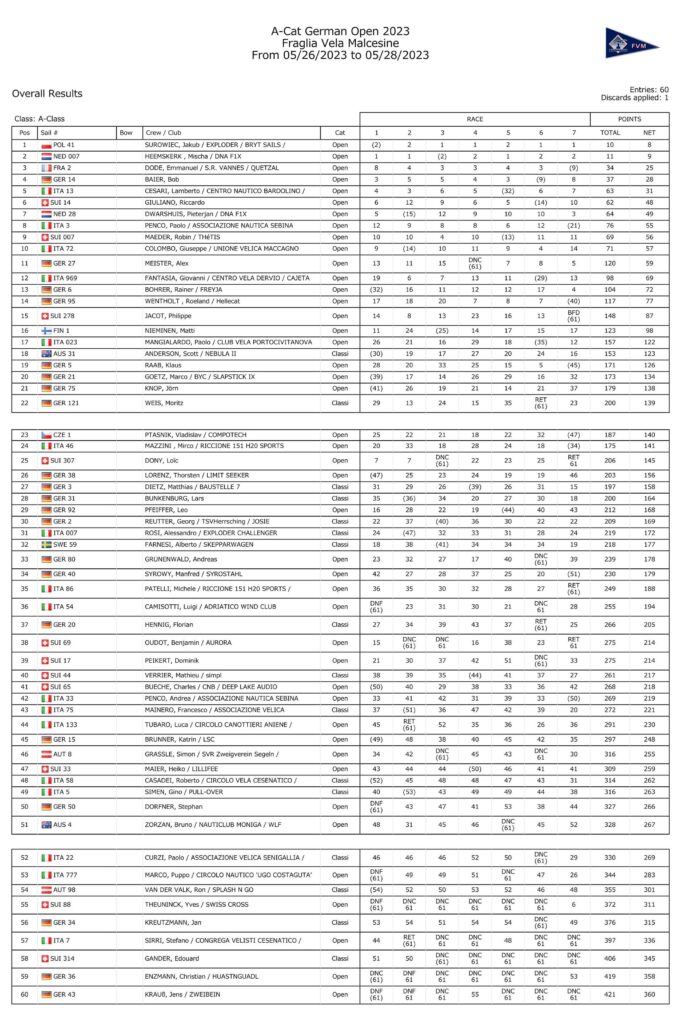 60 A-Cat trafen sich beim berühmten Segelclub Fraglia Vela Malcesine (FVM) zur German Open 2023 und es wurde eine hochklassige Regatta mit engen und sehr taktischen Rennen bei etwa 7 bis 15 Knoten Wind. Der Wind weht am Ufer am stärksten, sodass bei jeder Kreuz und Vorwind ein guter Start und mehrere geschickte Manöver erforderlich sind. Es gab viel Action und Positionswechsel auch bei den Führenden, – so war eine Menge los!