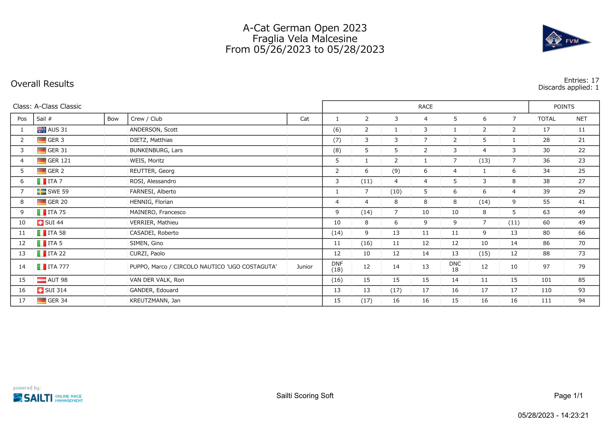 Am Ende gewinnt der Australier Scott ANDERSON zudem die Classic-Wertung klar gegen Matthias Dietz und Lars BUNKENBURG, beide aus Deutschland. Die jungen Moritz WEIS und Georg REUTTER, ebenfalls aus Deutschland, folgen in der Floater-Disziplin auf den Plätzen vier und fünf. Herzlichen Glückwunsch an Alle!